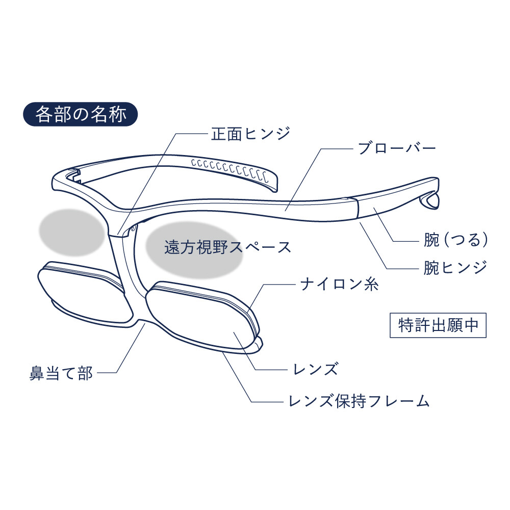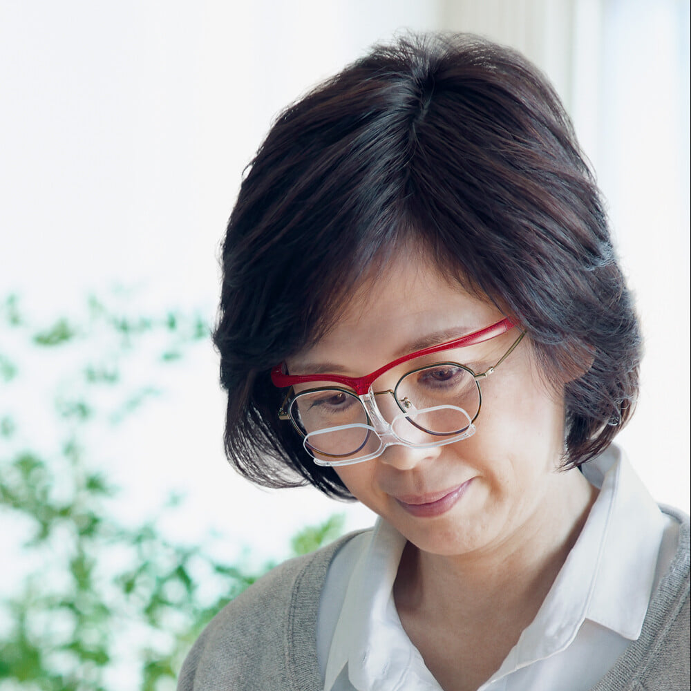 視線を移すだけで、手元を大きくハッキリと、離れたところもしっかりと、両手が自由に使えて、軽量で疲れにくい、新しいメガネ型ルーペです。