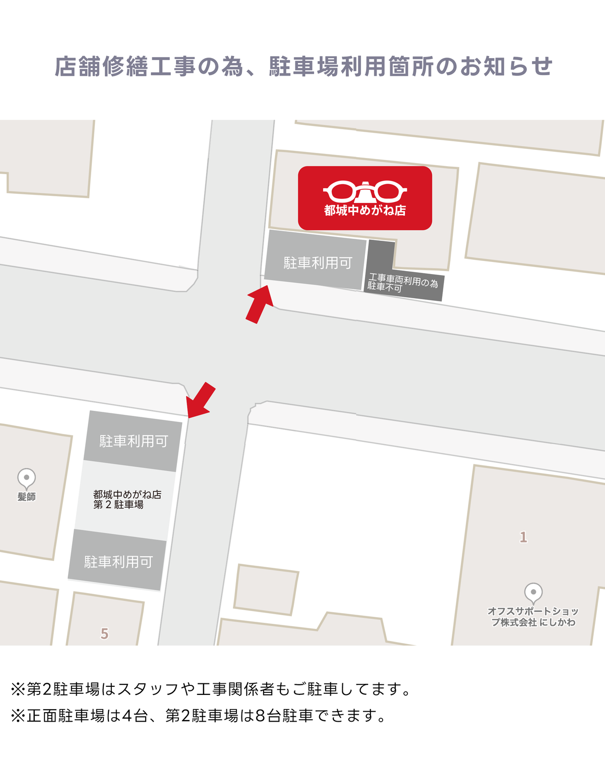 【お知らせ】店舗修繕工事の為の、駐車場利用箇所についてのお知らせ 2024年11月07日 いつも都城中めがね店をご利用いただきまして、誠にありがとうございます。 本日(11/7)より店舗修繕のため、一部箇所の工事に入ります。 営業につきましては、通常通りの営業をしております。 駐車場に関しては、画像の場所がご利用できますので、お気軽にご来店下さいませ。 宜しくお願い致します < 前の記事次の記事 >